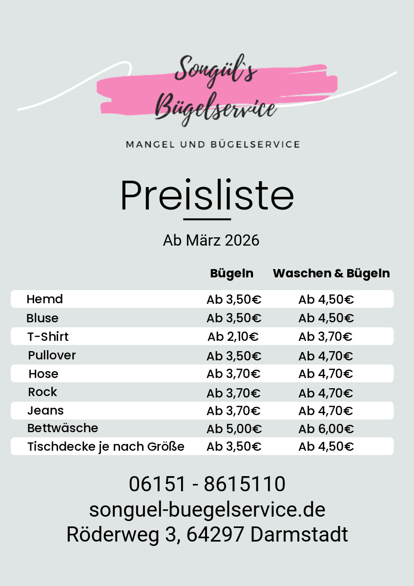 Seit 2017 bieten wir in Darmstadt-Eberstadt professionellen Bügel- und Mangelservice für Privat- und Geschäftskunden.